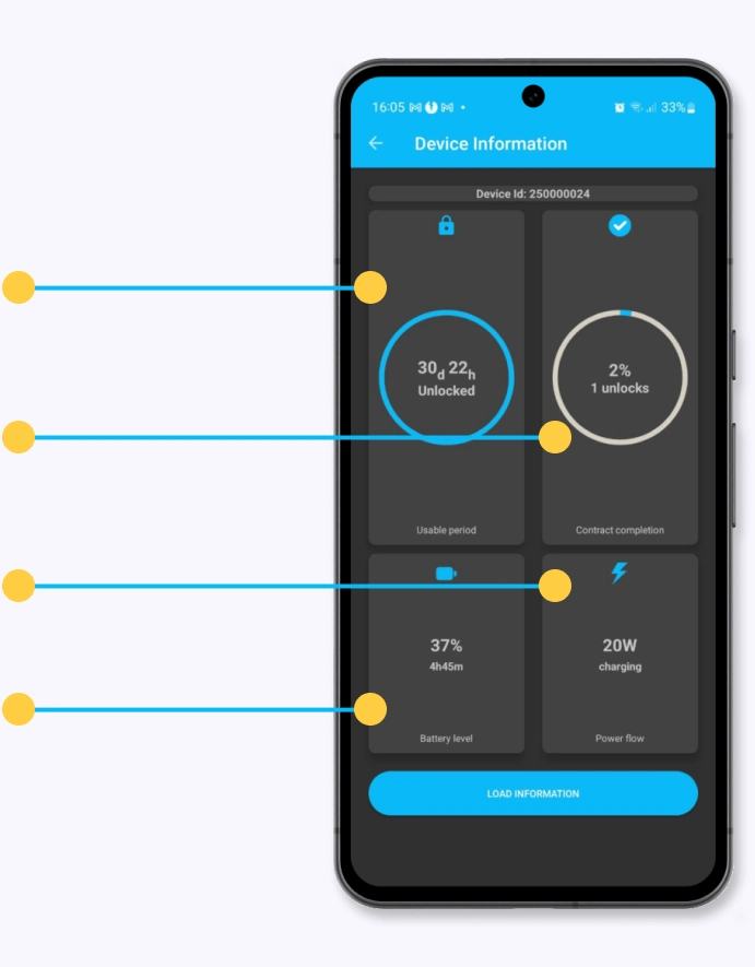 Subscriber has access to the power connect App. From any Android phone, families can see their energy use, track their battery level, re-activate their power, and manage their accounts. Â We combine systems with solar generation, storage, and distribution tools to create tailor-made networks that are reliable, efficient, and sustainable.